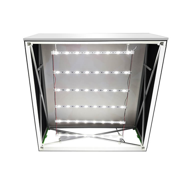 FramePlus SEG pop-up backlit counter, 850 mm high, silicone-edge fabric wrap glows for meet-and-greet expo desk. FramePlus SEG pop-up backlit counter, 850 mm high, silicone-edge fabric wrap glows for meet-and-greet expo desk.