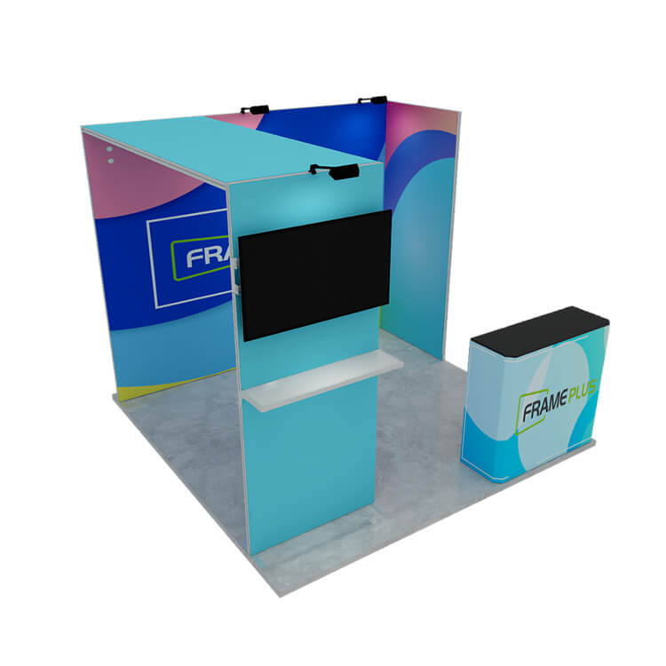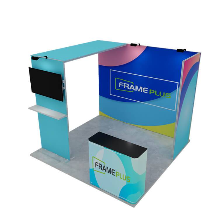 FRAMEPLUS® Foldable SEG Fabric Displays feature a lightweight foldable frame and colorful tensioned fabric patterns to help you build a professional booth on a small budget. System 1's style is simpler, but the 3x3m size, with shelves and lights, can fully meet the exhibition needs of small businesses!